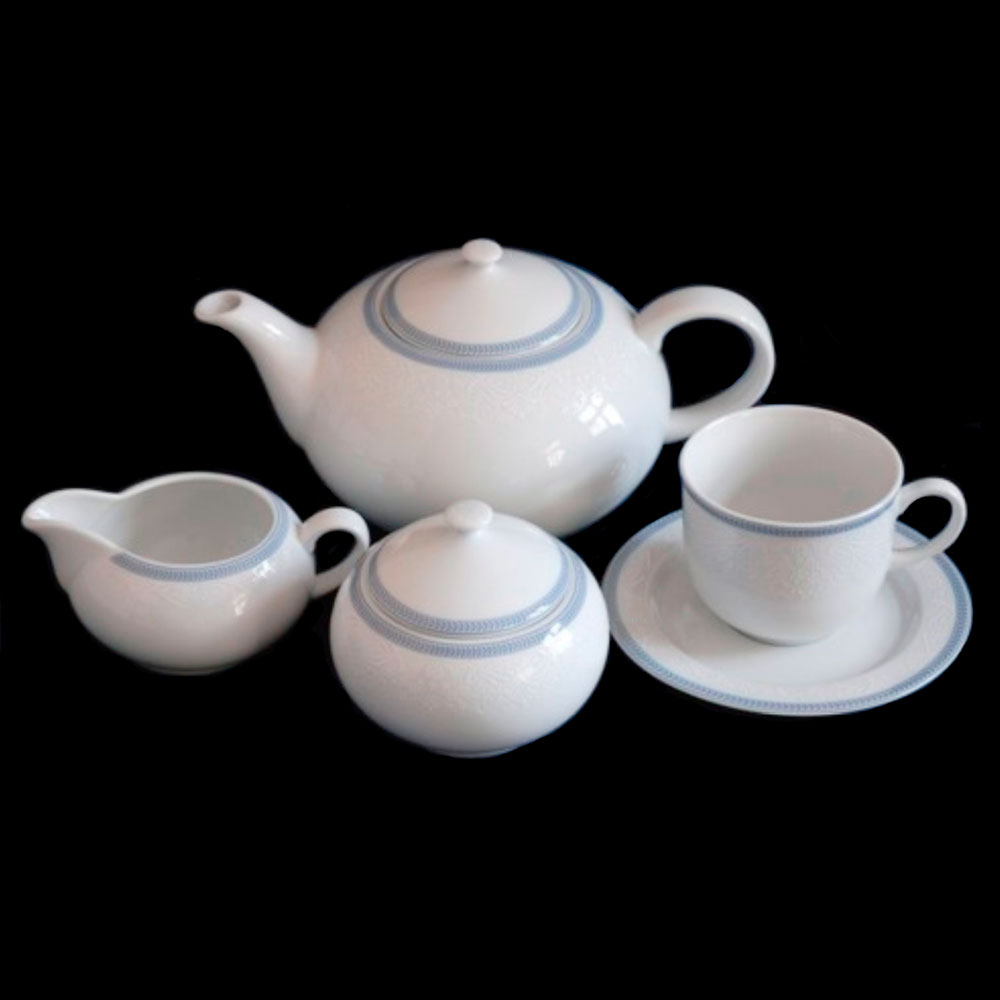 Материал: высококачественный фарфор белого цвета, синий рисунок по краях, белый узор по корпусу. Чайный сервиз рассчитан на 6 пресон, в комплекте есть самые необходимые предметы сервировки стола для чаепития. При необходимости сервиз можно доукомплектовать наборами чашок на большое количество персон или дополнительными отдельными предметами для сервировки. Посуд данного декора рекомендуется мыть вручную.