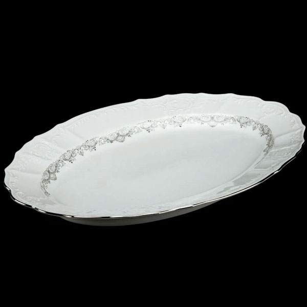 Материал: высококачественный фарфор. Фарфор белого цвета с элегантным рельефным рисунком, платиновой отводкой и рисунком серебряного цвета. Овальное плоское блюдо предназначено для подачи на стол мясной, овощной или рыбной нарезки. Не можно использовать данный декор в микроволновой печи. Рекомендуется мыть вручную.