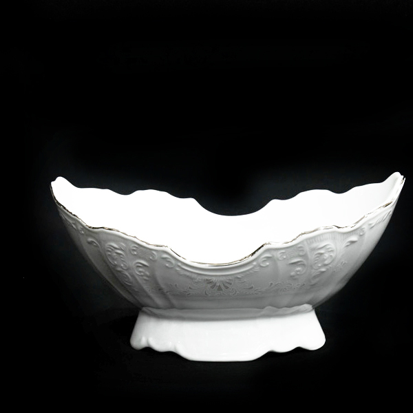 Матеріал: високоякісний фарфор. Фарфор білого кольору з елегантним рельєфним малюнком і сріблистим ободком. Його прочна структура і стійкість до сколам дозволяє використовувати цей посуд кожен день. Фарфор чешского виробника Thun завжди буде виглядати на Вашому столі елегантно і в теж час нарядно і торжественно. Висока якість продукції «Thun» досягається багатовіковим досвідом у виробництві фарфору. Використання самих сучасних технологій дозволяє виробляти вироби різних розмірів і форм.