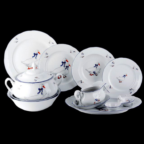 Материал: высококачественный фарфор. Фарфор белого цвета с изысканным голубым ободком и рисунком с гусями создаст атмосферу праздника. Его прочная структура и устойчивость к сколам позволяет пользоваться данной посудой каждый день. Фарфор чешского производителя Thun всегда будет выглядеть на Вашем столе элегантно и в тоже время нарядно и торжественно. Высокое качество продукции «Thun» достигается многовековым опытом в производстве фарфора. Использование самых современных технологий позволяет производить изделия различных размеров и форм.