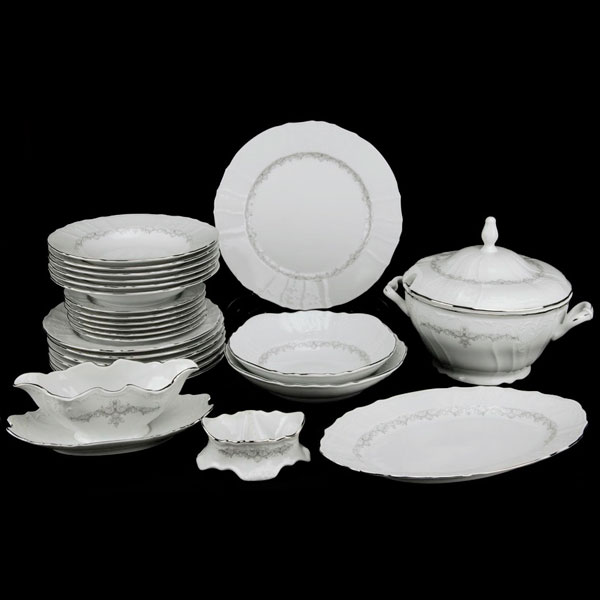Материал: высококачественный фарфор. Фарфор белого цвета с элегантным рельефным рисунком, платиновой отводкой и рисунком серебряного цвета.
