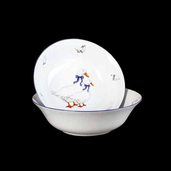 Материал: высококачественный фарфор. Фарфор белого цвета с округлыми стройными формами, синим ободком и рисунком с гусями. В комплект входит 6 пиал диаметром 13 см. Фарфор чешского производителя Thun всегда будет выглядеть на Вашем столе элегантно и в тоже время нарядно и торжественно.