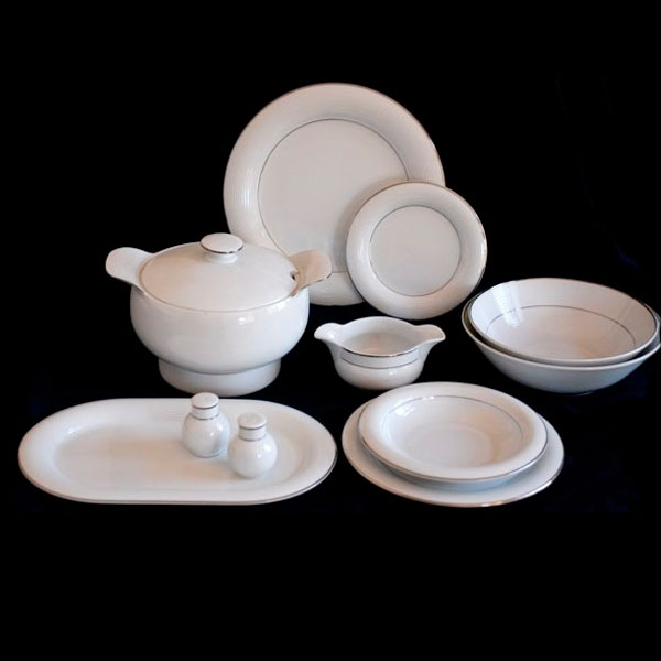 Материал: высококачественный фарфор белого цвета с изысканным платиновым ободком. Столовый сервиз рассчитан на 6 пресон, в комплекте самые необходимые предметы для сервировки стола. При необходимости столовый сервиз можно доукомплектовать наборами тарелок на большое количество персон или дополнительными отдельными предметами для сервировки. Сервиз этого декора идеально сочетается с другими элементами сервировки торжественного стола.