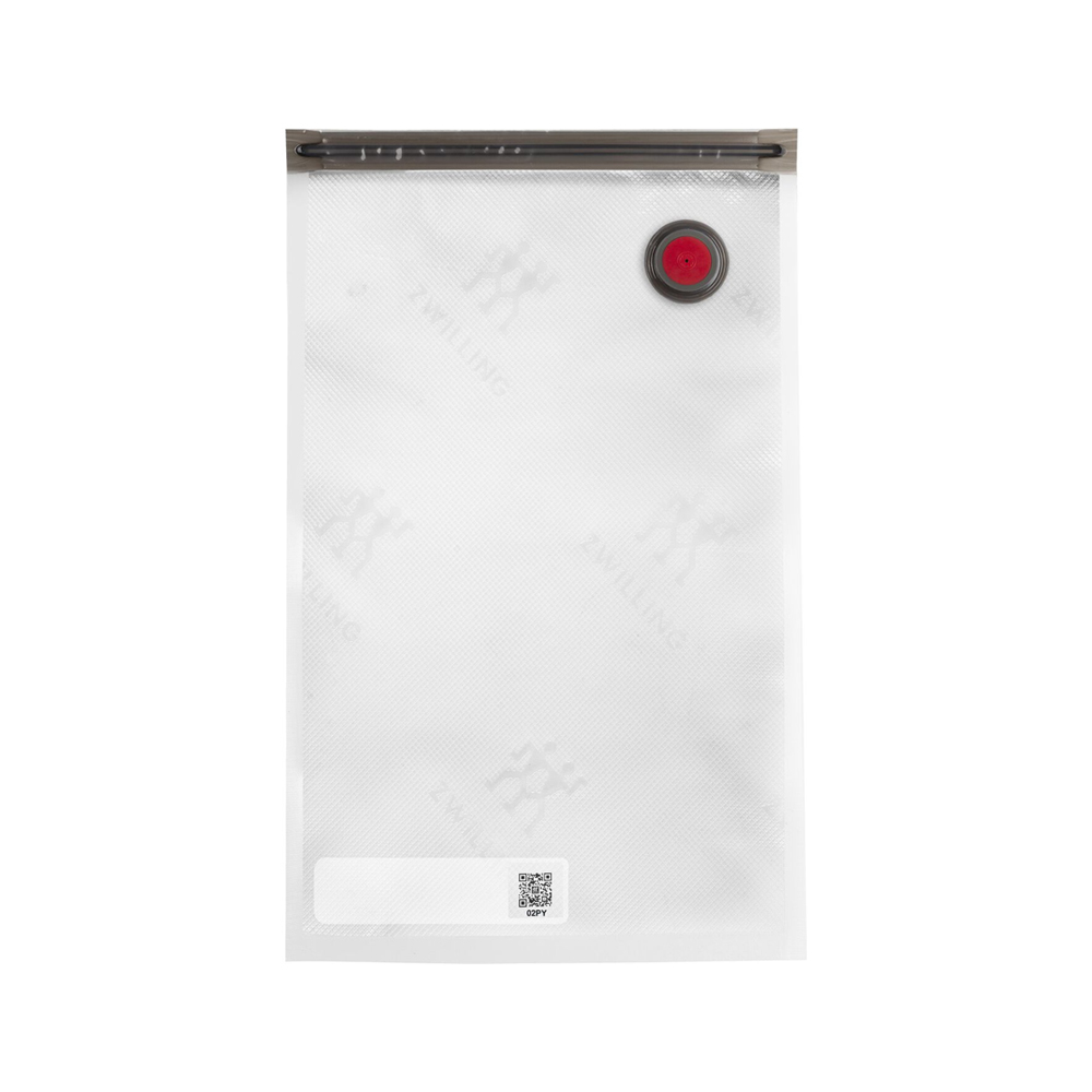 Обращение с вакуумным пакетом - это детская игра: положыте продукты и закройте пакет с помощью практичной молнии. Теперь вставте умный беспроводной вакуумный насос на соответствующий клапан на сумке. После соеденение он удаляет воздух из пакетов за секунды и автоматически останавливается, как только создается достаточный вакуум. Теперь все, что вам нужно сделать, это нажать кнопку в центре красного силиконового клапана, чтобы надежно закрыть его: ароматы и витамины надежно сохраняются, а еда остается свежей в пять раз дольше! Каждый пакет имеет индивидуальный идентификатор, чтобы замороженные продукты можно было быстро и легко найти. Просто отсканируйте QR-код перед наполнением и отслеживайте вакуумные пакеты в приложении ZWILLING Culinary World. Функция автоматического напоминания в бесплатном приложении позволяет вам в любой момент узнать, когда ваши продукты должны быть обработаны.