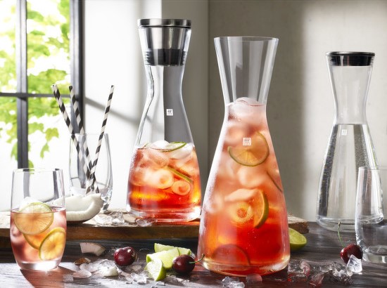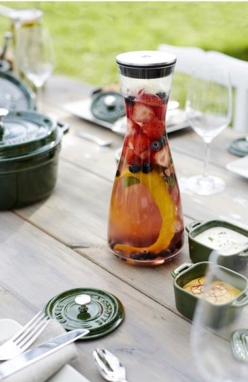 Ярко-красные ягоды, зеленые травы и желтые ломтики лимона создают интересный контраст с дизайнерским графином, созданным Matteo Thun & Antonio Rodriguez, который отличается четкими линиями и прохладным блеском. Этот стеклянный графин с крышкой из нержавеющей стали отлично будет смотрется как на праздничном столе, так и на садовом столе.