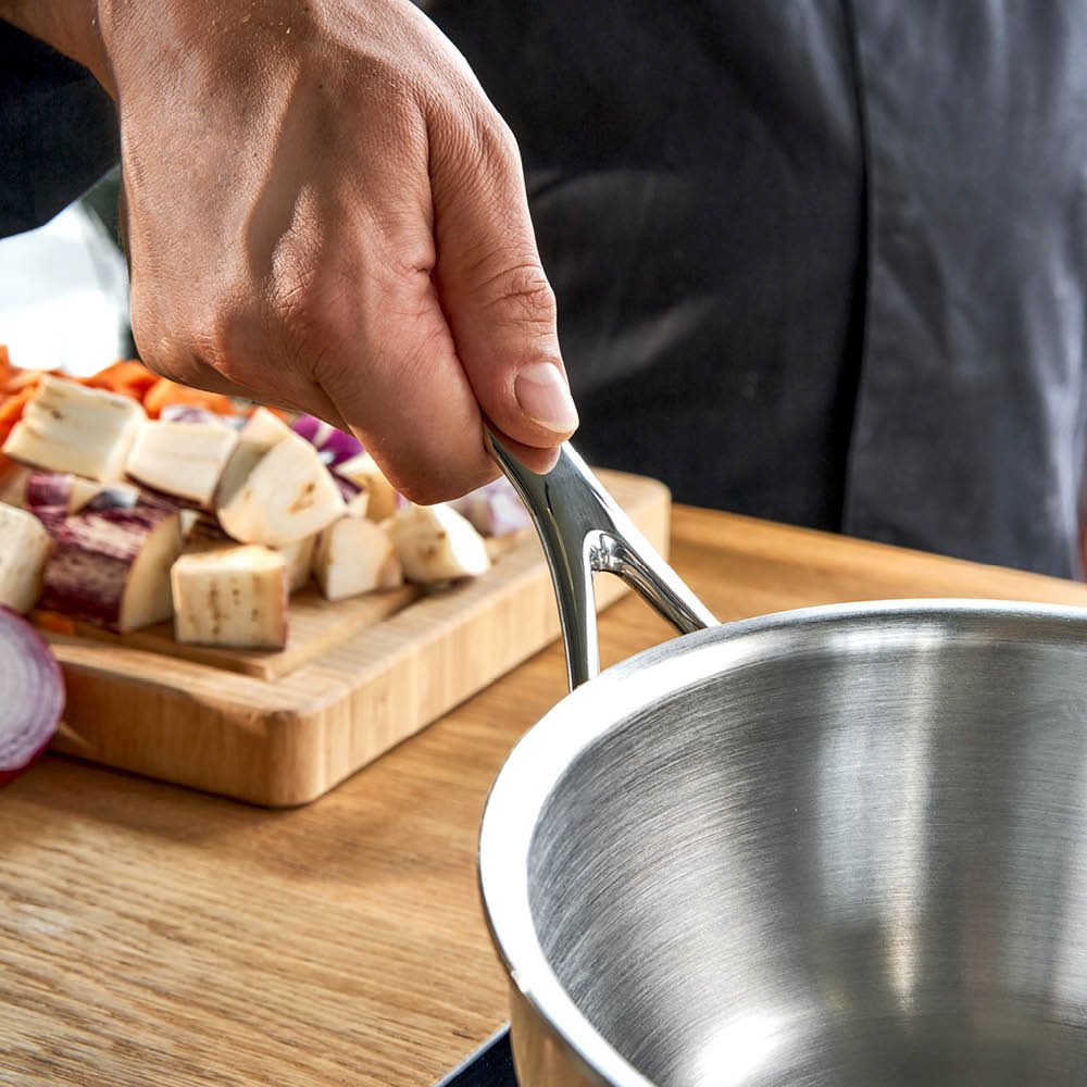 Сотейник изготовлен из матовой полированной нержавеющей стали 18/10, что позволяет быстро и бережно готовить вкусные блюда. Благодаря алюминиевому сердечнику многослойное дно отводит тепло и распределяет его прямо к краю соусника. За счет уникальному покрытию Silvinox® посуда не меняет цвет, она остается блестящей, и вы без труда очищаете ее.