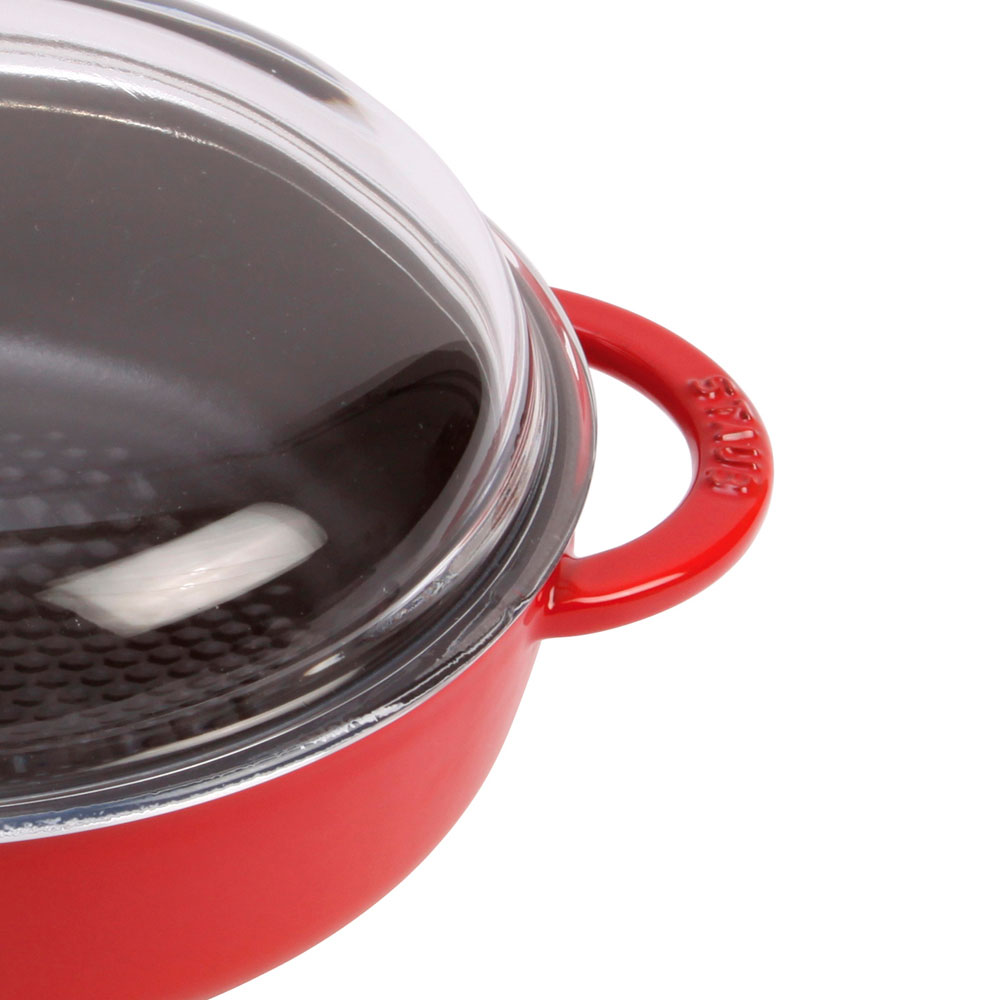 Сотейники Staub делаются из чугуна, который равномерно распределяет тепло по всей посуде, вплоть до краев. Внутри покрыты эмалью, которое имеет антипригарные свойства, не царапается и позволяет сохранить подлинный вкус продуктов. Инновационная, запатентованная технология увлажнения Chistera. Обеспечивает оптимальный и постоянный эффект увлажнения. Декоративная ручка изготовлена из латуни или никеля и выдерживает температуру до 250° C. Кроме этого, чугун уникален еще и тем, что он способен выделять в процессе готовки в небольших количествах, необходимое организму железо. Идеально подходит для жарки и тушения мяса, рыбы, овощей и других блюд, которыми Вы сможете порадовать своих гостей. Выбор профессиональных поваров и любителей.