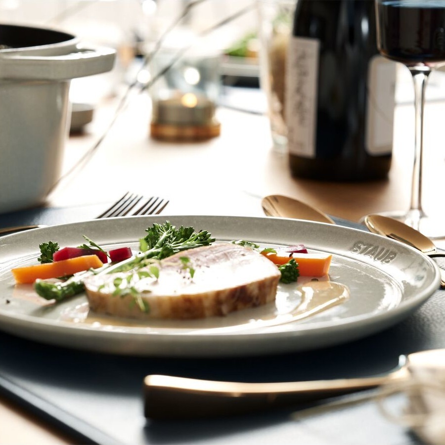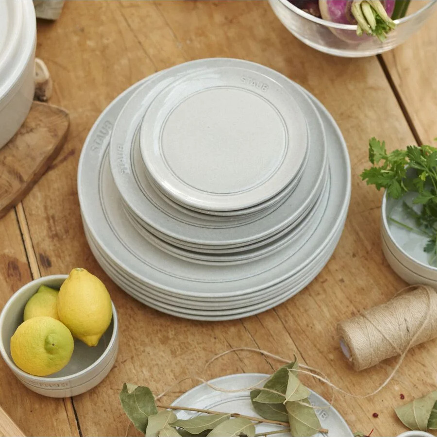 Фирма Staub производит свою продукцию из материалов самого высокого качества. Гармоническое сочетания совершенства и элегантности делает их на голову выше остальных фирм. Все изделия тщательно проверяются на соответствие всем современным требованиям к керамической посуде и имеют множество разнообразных форм и размеров, чтобы удовлетворить все потребности клиента. Тарелка для завтрака Staub изготовлена из высококачественной керамики и покрыта эмалевым слоем. Благодаря этому ее легко чистить, она очень прочная и устойчивая к царапинам. Ее дизайн вписывается в любую кухню, будь то современный или в стиле кантри. В линейке керамических изделий "White Truffle" есть также тарелки и чашки для полной и гармоничной сервировки стола.