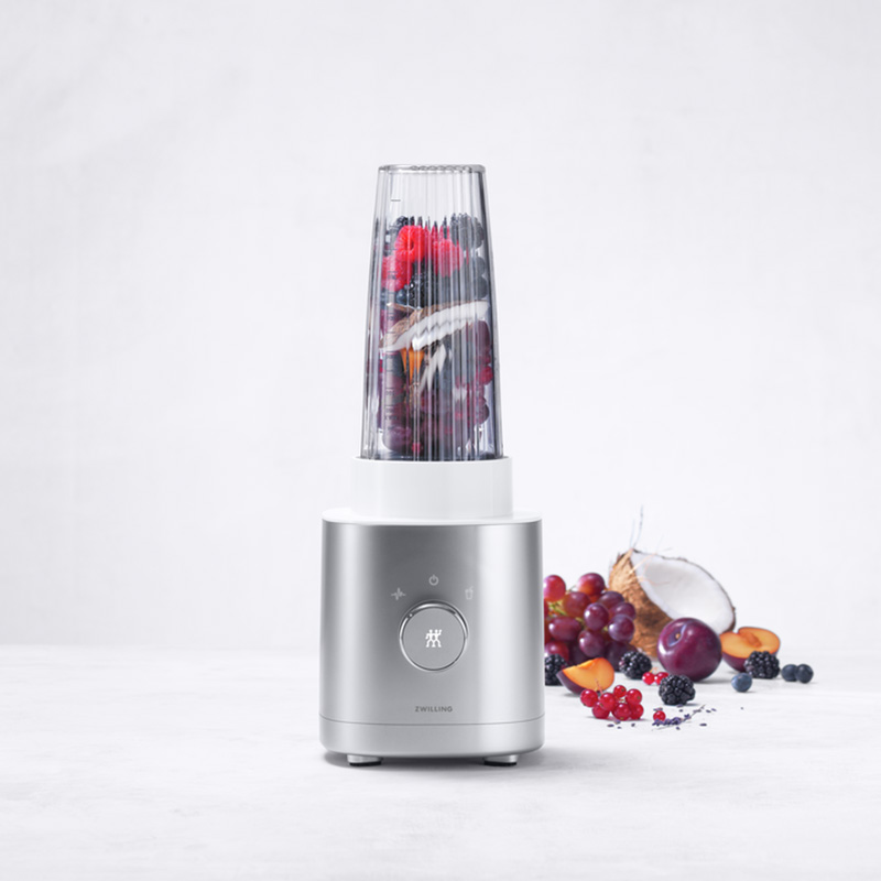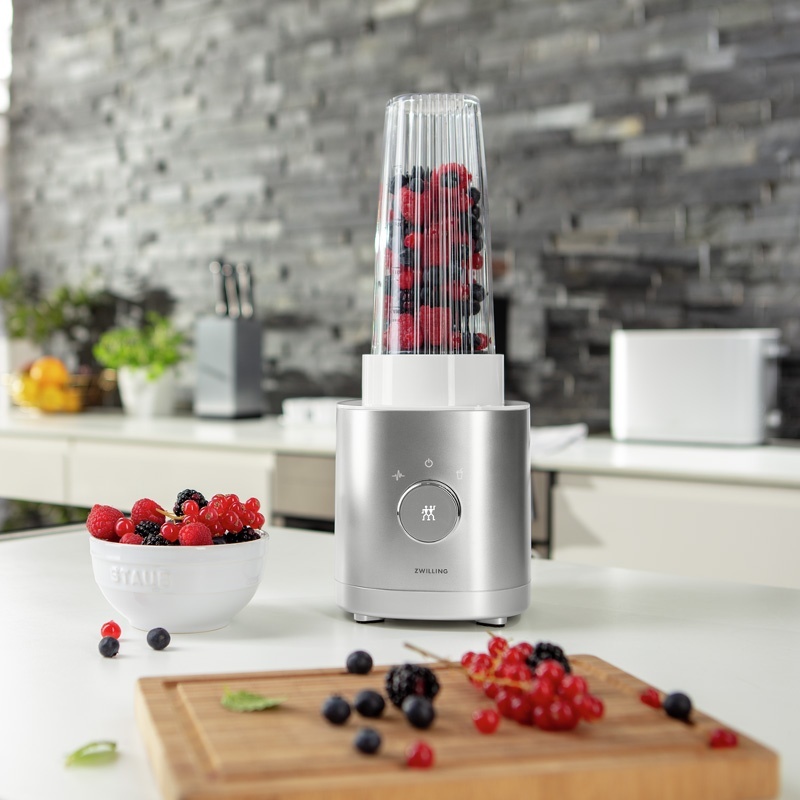 Ідеальне поєднання лезвий високої якості з нержавіючої сталі ZWILLING, двигуна потужністю 600 Вт і оптимізованої форми контейнера забезпечує ідеальні результати. Контейнер для блендера об'ємом 550 мл виготовлений з тритану без бісфенолу. Він прочний і стійкий як до високих, так і до низьких температур. Легко чистити під проточною водою. Поверхності цього професійного блендера також дуже легко очистити завдяки сучасному дизайну з однією кнопкою і вбудованим дисплеєм. Завдяки спеціальній програмі безпеки пристрій можна використовувати тільки з кришкою, що гарантує безпечне та надійне використання.