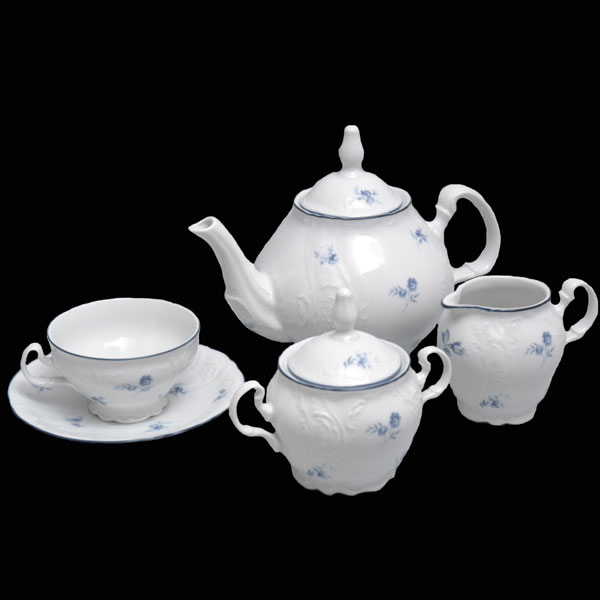 Матеріал: високоякісна порцеляна білого кольору з красивим рельєфним малюнком та синіми квіточками. Чайний сервіз розрахований на 6 осіб, в комплект входять найнеобхідніші ємності для чаювання. При необхідності сервіз можна доукомплектовувати наборами чашок на більшу кількість персон або ж додатковими окремими предметами для сервірування. Посуд даного декору рекомендуємо мити лише вручну.