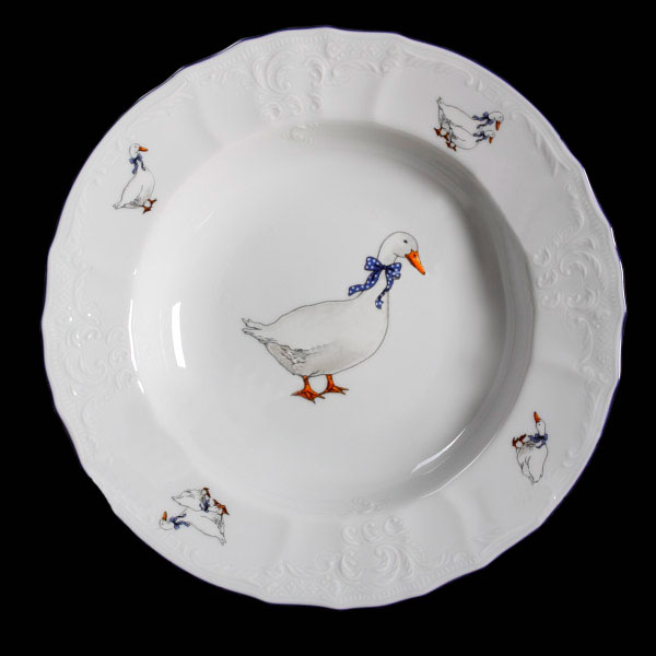 Матеріал: високоякісна порцеляна білого кольору з синім обідком і малюнком з гусями