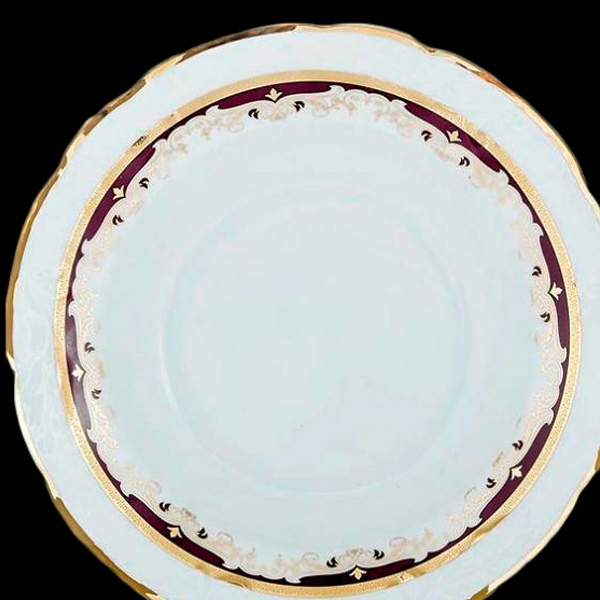 Матеріал: високоякісна порцеляна білого кольору з рельєфним малюнком та золотисто-червоним обідком